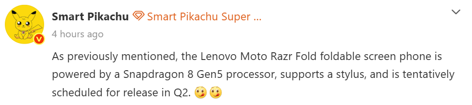 Motorola анонсировала складной смартфон Razr Fold на выставке CES 2026 в январе этого года. Устройство должно составить конкуренцию другим складным новинкам этого года, таким как Honor Magic V6, Oppo Find N6, Vivo X Fold 6 и Samsung Galaxy Fold 8, но официальной информации о начале продаж до сих пор не было. Теперь инсайдер Smart Pikachu раскрыл, когда гаджет может появиться на рынке.