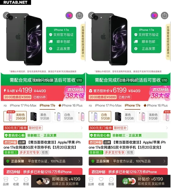 Согласно официальному плану, устройство поступит в продажу 11 марта. Однако на канале Pinduoduo, предлагающем скидку в 10 миллиардов юаней, вся серия iPhone 17e уже продаётся со скидкой в 300 юаней. Так, версия на 256 ГБ теперь стоит 4199 юаней, а версия на 512 ГБ — 6199 юаней.