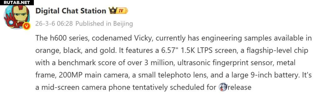 Согласно утечке, текущие инженерные прототипы Honor 600 (кодовое имя Vicky) будут доступны в оранжевом, чёрном и золотом цветах. Базовая модель получит 6,57-дюймовый LTPS-дисплей с разрешением 1,5K. В качестве «сердца» аппарата будет использоваться флагманский чипсет, способный набирать более 3 миллионов баллов в бенчмарках.