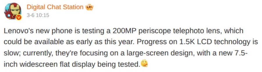 Новая утечка указывает на то, что компания Lenovo может испытывать необычное аппаратное обеспечение для своих будущих смартфонов. Согласно сообщению известного инсайдера Digital Chat Station в Weibo, Lenovo в настоящее время тестирует перископическую телефотокамеру с большим сенсором на 200 мегапикселей для своих следующих телефонов.