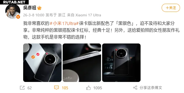 Гонконгский актёр Дэниел У (Дэниел У) поделился в соцсетях открытием новой версии флагманского смартфона. Он написал: «Моя любимая модель Xiaomi 17 Ultra Leica Edition вышла в новом цвете «Чёрное серебро», и я не могу дождаться, чтобы поделиться этим с вами. Очень чистое сочетание чёрного и серебряного с красной эмблемой Leica — это классика!»