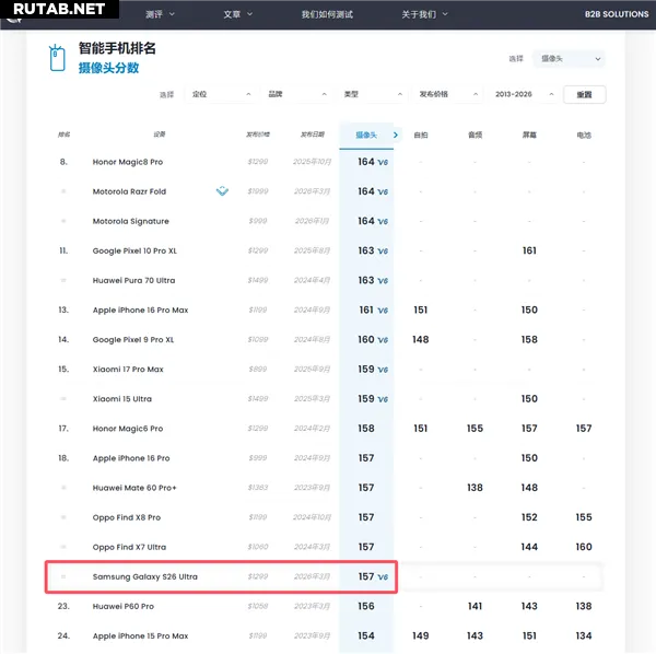 По итогам тестов по шестой версии бенчмарка DxOMark для фото и видео, Galaxy S26 Ultra набрал 157 баллов. Этого результата хватило для того, чтобы занять 18-ю строчку в глобальном рейтинге лучших камерофонов.