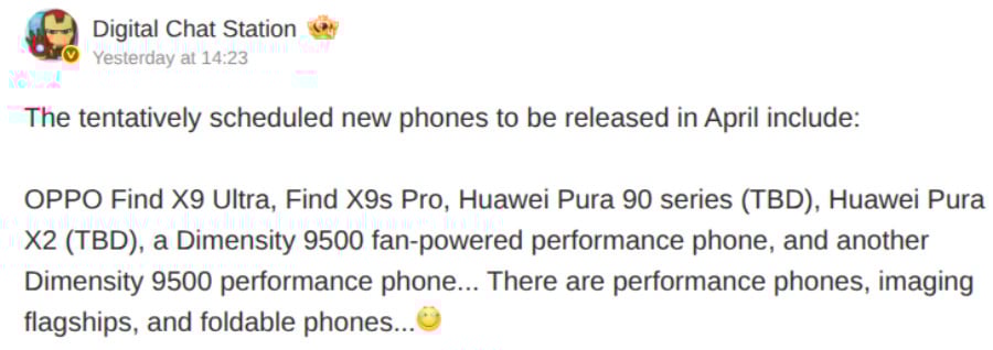 Согласно утечке, в апреле дебютируют смартфоны Oppo Find X9 Ultra и Oppo Find X9s Pro, а также давно ожидаемая серия Huawei Pura 90. Кроме того, в списке значится широкоформатная складная модель Huawei Pura X2 и два производительных аппарата на базе чипсета MediaTek Dimensity 9500.