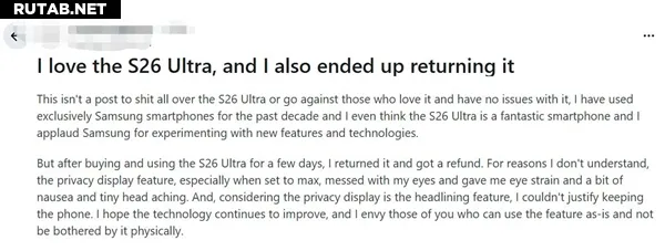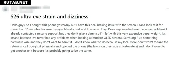 Однако с массовым поступлением устройства в продажу некоторые пользователи начали жаловаться в соцсетях на дискомфорт. Несколько человек сообщили, что после использования Galaxy S26 Ultra у них появились заметная усталость глаз, головокружение и даже тошнота.