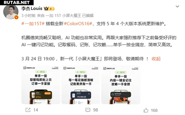 Смартфон OnePlus 15T, анонс которого запланирован на 24 марта, будет работать на новой операционной системе ColorOS 16. Об этом заявил президент OnePlus в Китае Ли Цзе (Li Jie).