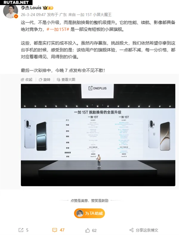 Сегодня, 24 марта, в 19:00 по пекинскому времени (14:00 по московскому) состоится официальная презентация смартфона OnePlus 15T. Производитель позиционирует новинку как «мечту поклонников компактных устройств».