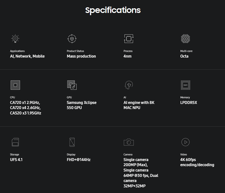 Чип изготовлен по обновлённому 4-нанометровому техпроцессу Samsung. Конфигурация CPU стандартна для этого сегмента: одно ядро Cortex-A720 с частотой до 2,9 ГГц, четыре дополнительных ядра A720 и три энергоэффективных ядра A520. На бумаге ничего необычного, но новые ядра должны обеспечить более плавное переключение между приложениями и стабильную работу при длительном использовании.