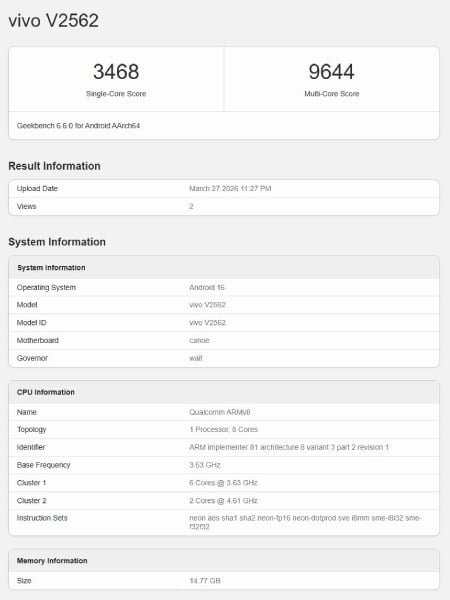 Устройство, идентифицированное по номеру модели V2562, работает на новейшем чипсете Qualcomm Snapdragon 8 Elite Gen 5. Он дополнен 16 ГБ оперативной памяти, работает под управлением Android 16 и набрал 3468 баллов в одноядерном и 9644 балла в многоядерном тестах.