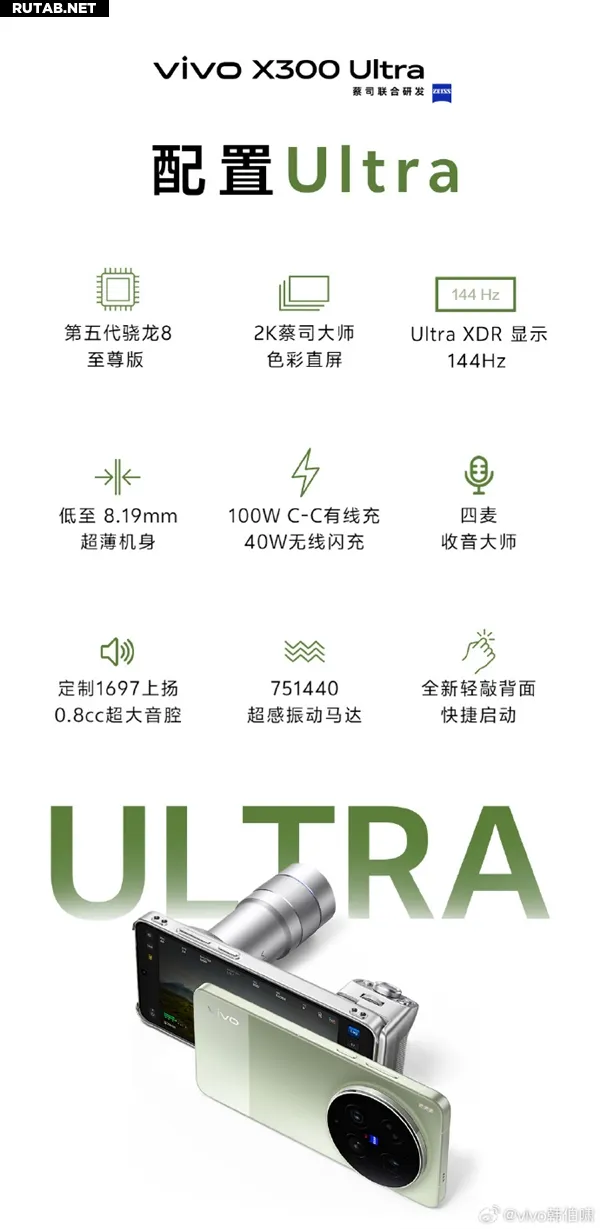 В плане общей производительности X300 Ultra получил все топовые характеристики: процессор Snapdragon 8 Gen 5, прямой 2K-дисплей с частотой обновления 144 Гц и поддержку проводной зарядки мощностью 100 Вт.