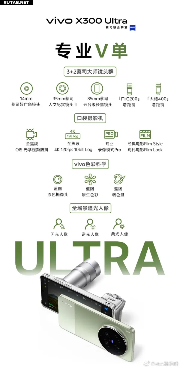 Согласно данным, vivo X300 Ultra оснащён системой из трёх объективов Zeiss: 14-мм сверхширокоугольным, 35-мм для документальной съёмки и 85-мм телеобъективом с гибридной стабилизацией. Также поддерживаются дополнительные линзы-удлинители «200» и «400».