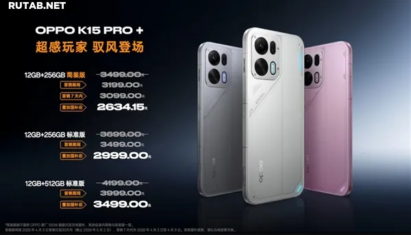 В плане ценообразования OPPO K15 Pro стартует с 2999 юаней, а версия без зарядного устройства в комплекте стоит 2899 юаней. С учётом государственных субсидий конечная цена для покупателя начинается от 2464.15 юаней. Более продвинутая K15 Pro+ в версии без зарядного устройства оценивается в 3099 юаней, а со скидкой — от 2634.15 юаней.