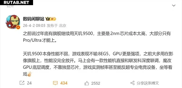 Как сообщается, Dimensity 9500 использует архитектуру, состоящую исключительно из больших ядер: одно сверхбольшое ядро с частотой 4.21 ГГц, три флагманских сверхбольших ядра и четыре высокопроизводительных больших ядра. Установленный в нём флагманский графический процессор G1-Ultra демонстрирует пиковую производительность на 33% выше, чем у предыдущего поколения.