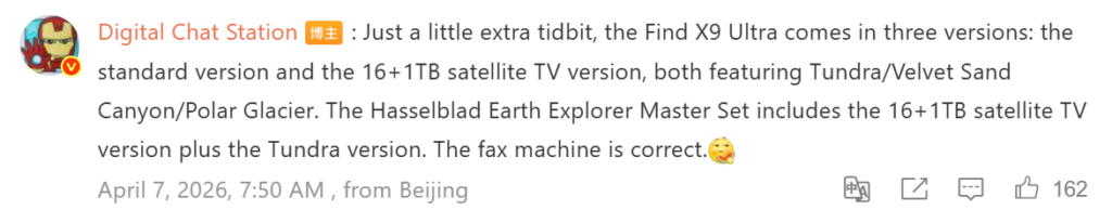 В связанном обновлении DCS сообщил, что Find X9 Ultra, как ожидается, выйдет в трёх версиях. Как стандартная модель, так и вариант со спутниковой связью и памятью 16 ГБ + 1 ТБ будут предлагаться в цветах «Земляная тундра», «Каньонный песок» и «Полярный ледник».