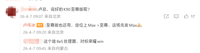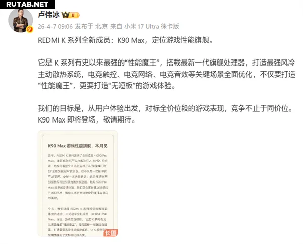 Важно отметить, что K90 Max — это не ожидаемая версия K90 Ultra, а совершенно новая модель. Партнёр Xiaomi и глава бренда Redmi Лу Вэйбин (Lu Weibing) в ответе пользователю подтвердил, что K90 Ultra всё ещё находится в разработке, но по позиционированию K90 Max будет выше неё.