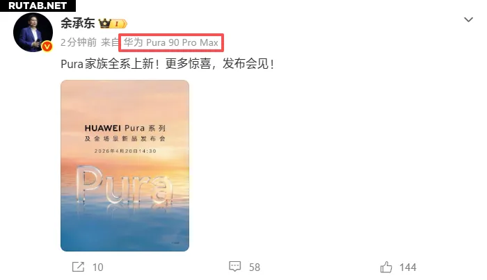 Председатель совета потребительского бизнеса Huawei (Consumer BG) Юй Чэндун официально объявил, что презентация новой серии Huawei Pura и других продуктов для всех сценариев использования состоится 20 апреля в 14:30 по пекинскому времени (09:30 мск).