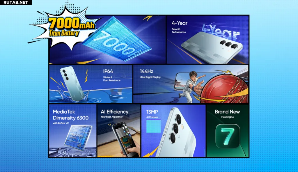 Смартфон работает на чипсете MediaTek Dimensity 6300 и оснащён системой жидкостного охлаждения с паровой камерой площадью 5300 мм². Realme заявляет, что устройство оптимизировано для плавной работы в течение четырёх лет. На передней панели расположен 6,9-дюймовый LCD-дисплей с частотой обновления 144 Гц и пиковой яркостью 900 нит, что должно обеспечить более плавную прокрутку и лучшую видимость на улице.