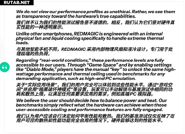 Компания Nubia оперативно отреагировала на обвинения официальным заявлением. В нём утверждается, что такая производительность не является фальшивой, а отражает реальный потенциал аппаратного обеспечения. Для поддержки экстремальных нагрузок в данной модели специально установлены физический кулер и система жидкостного охлаждения, которые на аппаратном уровне решают проблему тепловыделения.