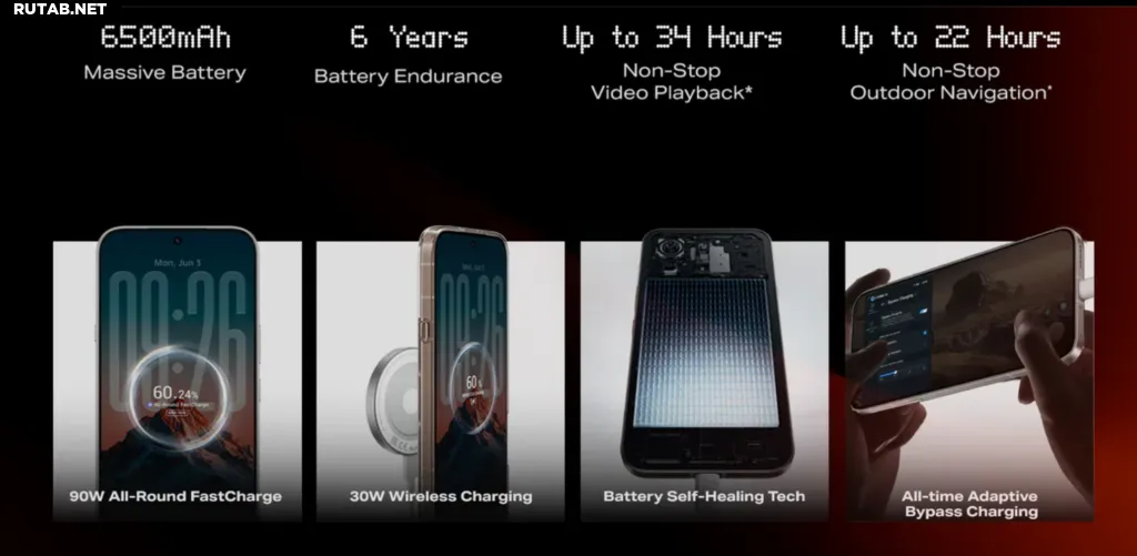 Note 60 Pro получит массивный аккумулятор ёмкостью 6500 мА·ч с поддержкой быстрой зарядки мощностью 90 Вт. Также поддерживается беспроводная зарядка на 30 Вт и обходная зарядка (bypass charging). Устройство оснащено датчиком сердечного ритма для мониторинга пульса, уровня кислорода в крови и вариабельности сердечного ритма через фирменное приложение My Health.