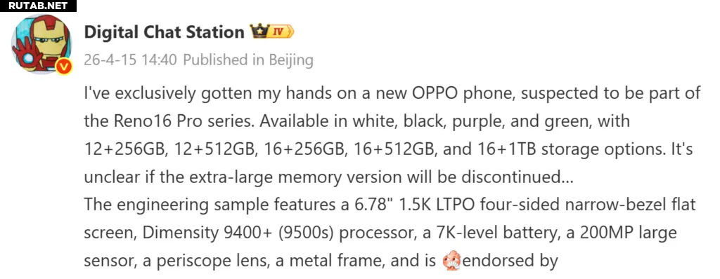 Сообщается, что Reno 16 Pro получит плоский OLED-дисплей LTPO с узкими рамками, диагональю около 6,78 дюйма и разрешением 1,5K. В плане дизайна устройство может получить металлическую рамку, что указывает на более премиальную сборку по сравнению с предыдущими моделями.