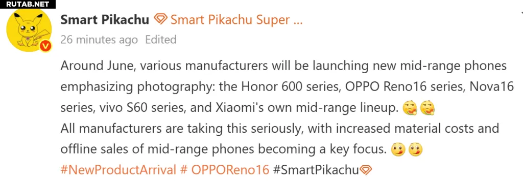 В Китае готовятся к выпуску новые смартфоны различных брендов, включая серию Oppo Reno 16, Honor 600, Huawei Nova 16 и Vivo S60. По данным инсайдера Digital Chat Station, серия Reno 16, как и другие модели, ожидается примерно в июне. Перед ожидаемым анонсом источник поделился ключевыми деталями о Reno 16 Pro и Reno 16.