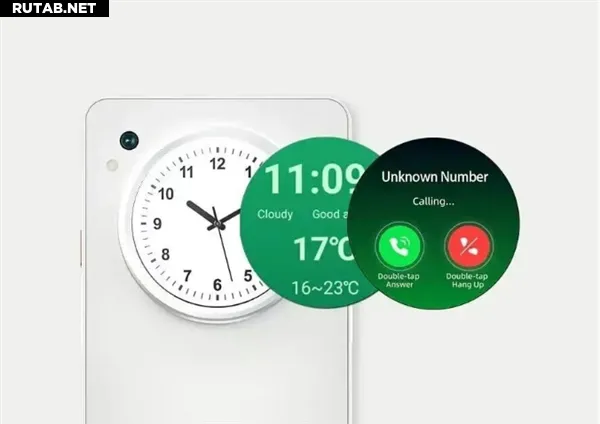 На задней панели расположен круглый LCD-экран диагональю 1.85 дюйма с разрешением 360 x 360 пикселей. Он предназначен для быстрого просмотра уведомлений, времени, погоды, а также может использоваться в качестве видоискателя для селфи, что упрощает кадрирование при съемке на основную камеру.