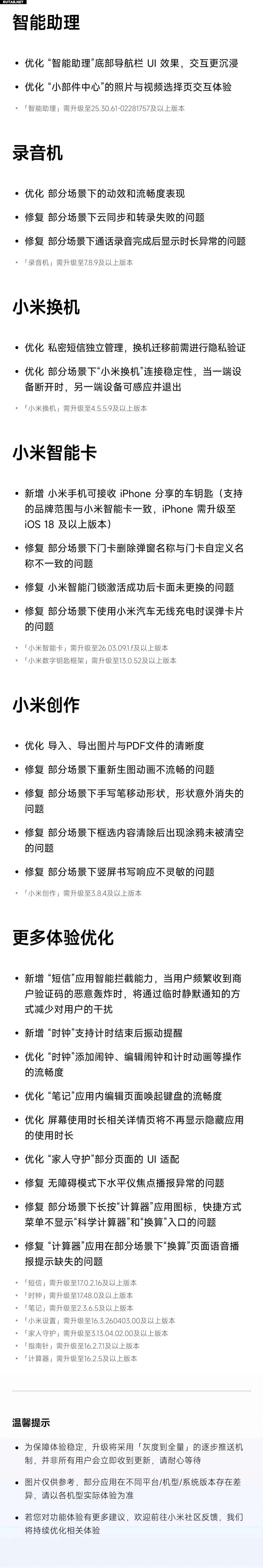 Проведена глубокая оптимизация системных компонентов. Повышена плавность работы приложения «Диктофон», исправлены проблемы с облачной синхронизацией и транскрибацией. В приложении для переноса данных Xiaomi улучшено управление приватными SMS: теперь перед миграцией требуется подтверждение. Система Xiaomi Smart Card научилась получать цифровые автомобильные ключи, отправленные с iPhone.