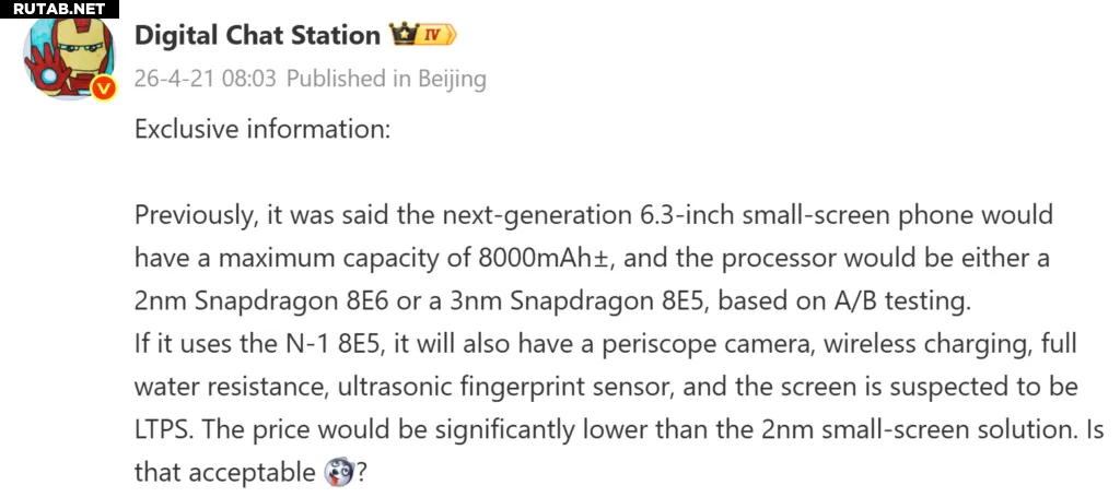 Что касается производительности, то, как сообщается, Honor тестирует два варианта чипсета: новый 2-нанометровый Snapdragon 8 Elite Gen 6 (8E6) и 3-нанометровый Snapdragon 8 Elite Gen 5 (8E5). Окончательное решение пока не принято. Если компания выберет немного более старую платформу 8E5, устройство всё равно сохранит премиальные функции, такие как перископическая телефотокамера, поддержка беспроводной зарядки, полная защита от воды и ультразвуковой сканер отпечатков пальцев.