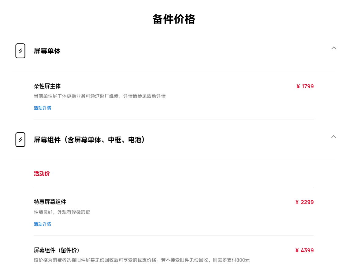 Стоимость сборки экрана (цена зарезервированной детали) составляет 4399 юаней. Эта цена действует при условии бесплатной утилизации старого экрана. Если пользователь не согласен на утилизацию, придется доплатить 800 юаней, и итоговая сумма составит 5199 юаней.