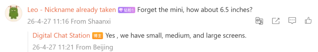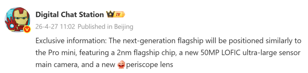 В комментариях к публикации один из пользователей спросил, будет ли «мини»-модель оснащена 6,5-дюймовым дисплеем, а не экраном меньшего размера. В ответ Digital Chat Station заявил, что линейка может включать варианты с маленьким, средним и большим экраном. Таким образом, компактный флагман, вероятно, получит 6,4-дюймовый дисплей, что типично для смартфонов такого форм-фактора.