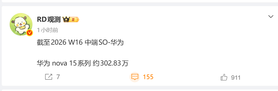 Согласно данным, опубликованным блогером «RD Observation», продажи смартфонов серии Huawei nova 15 достигли отметки примерно в 3,0283 миллиона единиц по состоянию на 16-ю неделю 2026 года, превысив порог в 3 миллиона.