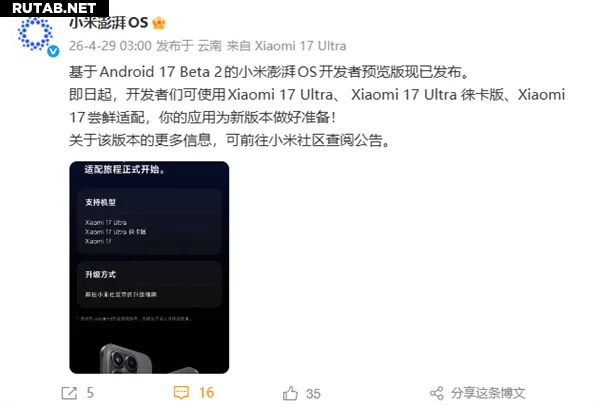 Сегодня, 29 апреля, компания Xiaomi официально объявила о выпуске HyperOS Developer Preview на базе Android 17 Beta 2.