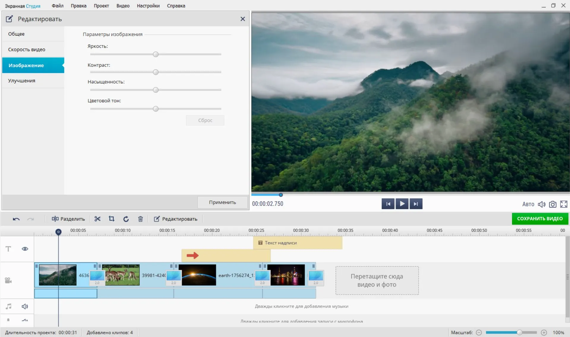 Экранная Студия — это универсальная программа для записи экрана и улучшения качества видео. Основные инструменты сосредоточены в блоке «Редактировать». Чтобы попасть в него, кликните правой кнопкой по нужному клипу и нажмите по одноименной кнопке. В этой вкладке можно настроить контраст, изменить насыщенность и подправить цветовой тон, а также повысить или понизить яркость, подправив кривыми слишком темные или пересвеченные кадры.