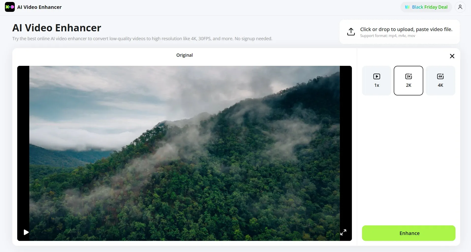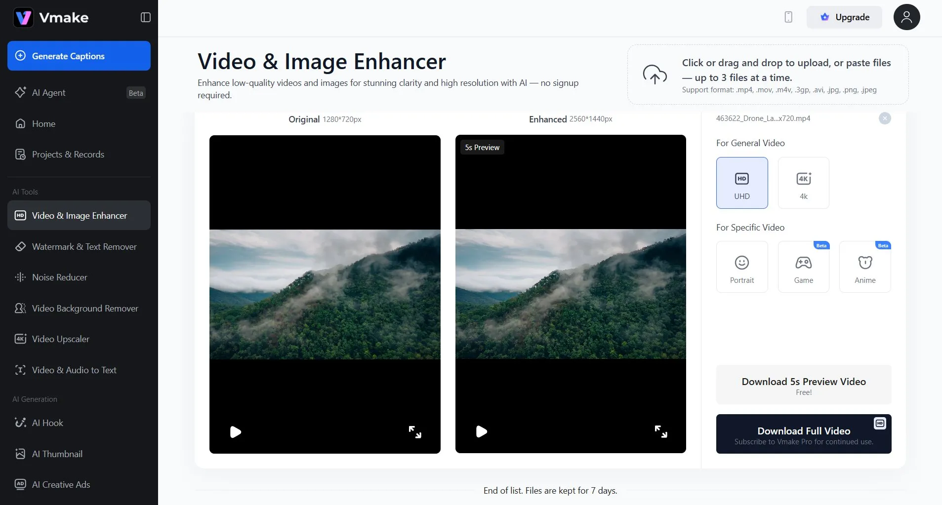 Веб-сервис с ИИ-инструментами, помогает быстро повысить качество без установки дополнительного софта. Загруженные видео могут быть размером до 1 ГБ и разрешением до 4K. Процесс работы максимально простой: достаточно загрузить файл и дождаться, пока сервис обработает его и предложит скачать улучшенную версию. Платформа способена преобразовывать ролики с 240р, 360р и 480р в HD. Дополнительные ИИ-алгоритмы помогают улучшить резкость, подправить цвета и убрать шумы на темных участках.