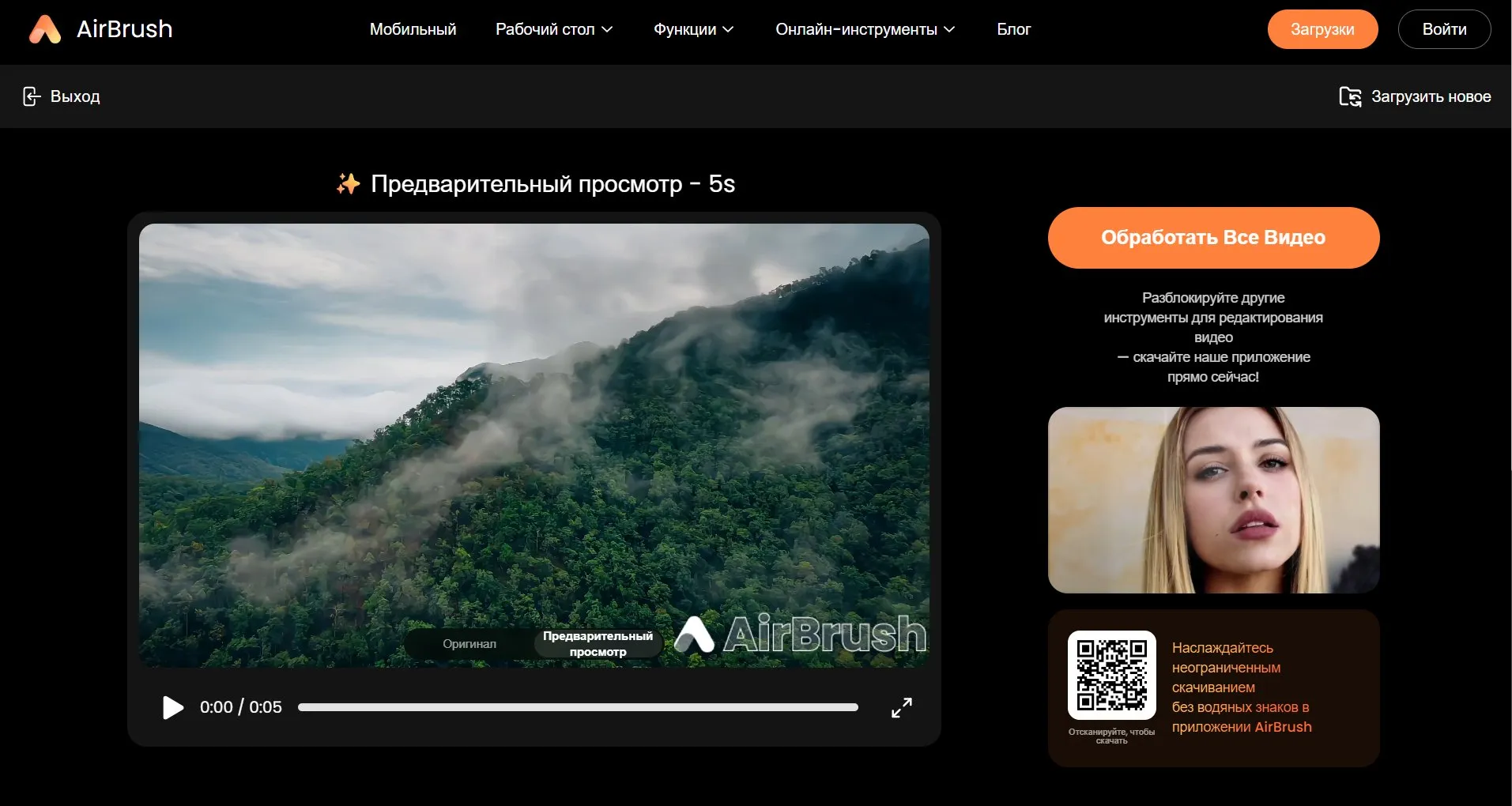 Это веб-приложение, которое применяет искусственный интеллект для автоматического улучшения качества видео. Подходит тем, кто хочет быстро получить четкий ролик из плохого исходника или восстановить старые записи. Алгоритмы AirBrush эффективно убирают размытость, увеличивая детализацию даже на фрагментах с движением, а также выполняют автоматическую цветокоррекцию, выравнивая оттенки и делая изображение более естественным.