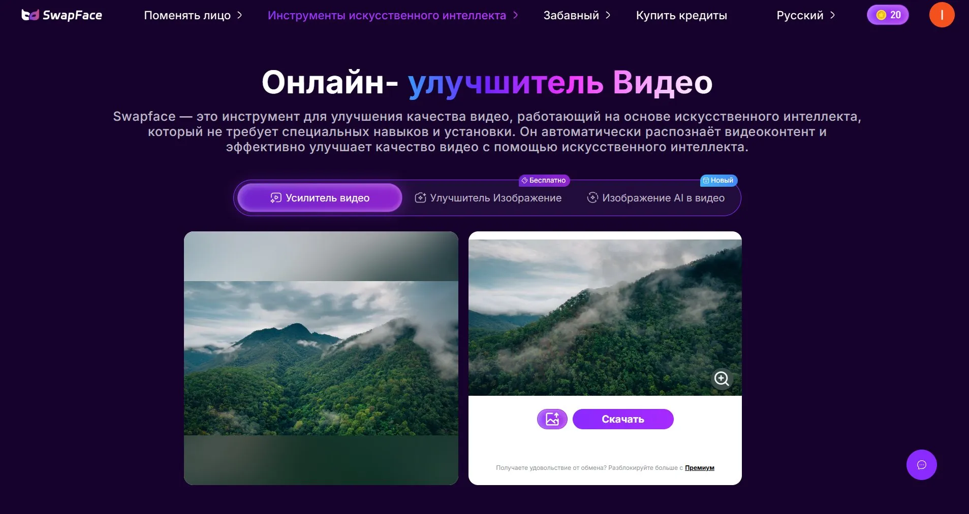 Веб-сервис с ИИ-инструментами, который помогает быстро улучшить качество, поднять разрешение и удалить шумы из кадра. Сайт повышает яркость, показывая детали, которые обычно теряются в тенях. Благодаря этому ролики, снятые в условиях низкой освещенности, становятся более четкими. Работать со SwapFace довольно удобно: достаточно загрузить ролик и нажать одну кнопку, после чего сайт автоматически применит необходимые улучшения.
