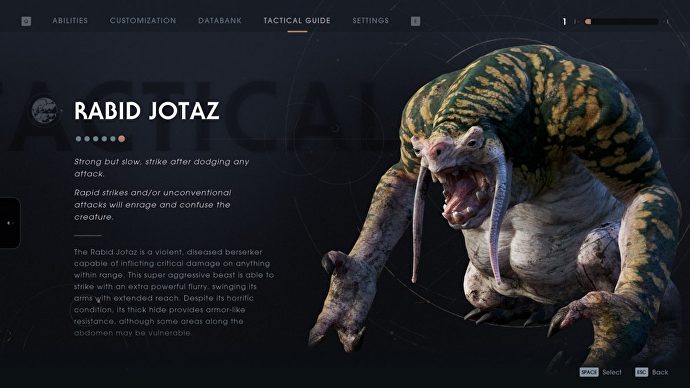 У рептилии есть только две неблокируемые атаки: первая - когда она отрывает передние лапы от земли, хлопает ими и прыгает на вас; а вторая - широко раскрыв пасть, наклоняет голову для укуса. Отражая эти атаки, зверь на несколько секунд теряет сознание, что позволит вам нанести один или два удара световым мечом.