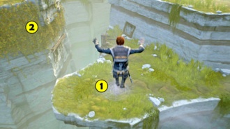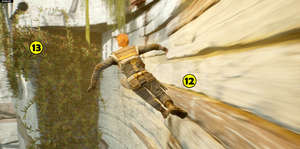 Теперь просто бегите по стенке (12) и поднимайтесь наверх на лианах (13). Можете немного осмотреть планету на предмет секретов (или вернуться к этому моменту позже в игре). Направляйтесь к кораблю.