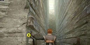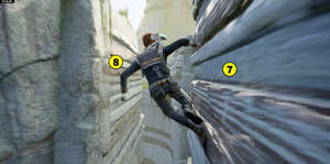 В какой-то момент вы достигнете пропасти со стенами рядом с вами. Прыгайте на одну (7), бегите по ней, затем прыгайте на другую (8) и продолжайте, пока не достигнете земли.