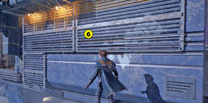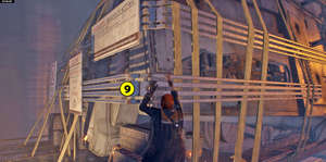 Выйдите через открытую дверь снаружу, пересеките балку и запрыгните на стену (6), затем начните идти налево к месту, где вы попадете в поезд.