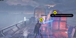 Вы попадете в открытое пространство, где вы научитесь блокировать (4) и отбивать выстрелы (5) во врагов. Разберитесь с еще двумя врагами и двигайтесь вперед. Убейте штурмовиков на крыше, а затем еще одного в центре вагона. Уничтожьте кабели справа и используйте компьютер.