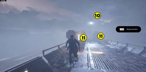 Вражеский дрон (10) появится позже. Спрячьтесь за препятствиями, подождите, пока он выпустит серию лазеров, затем бегите к следующим укрытиям (11), где можно переждать выстрелы.