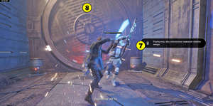 Внутри вы найдете группу штурмовиков (7). Используйте блоки и контр-атаки. Избавившись от своих соперников, используйте замедление на вращающемся колесе (8), после чего поднимитесь по нему на крышу.