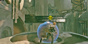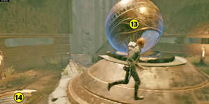 Толкните сферу (13), затем встаньте на кнопку (14) на земле, что активирует лифт.