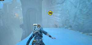 Поверните направо и начните скользить вниз по ледяному спуску. В конце прыгайте на стену справа (18), переходите к следующей, затем хватайтесь за веревку и прыгайте на землю.