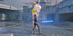 Робот имеет четыре типа атак - лазерный огонь, который можете отразить с помощью светового меча. Метание гранат и ракетный залп - вы можете отразить обе атаки (21) с использованием силы толчка. Особенно большой урон противнику наносит отталкивание ракет.