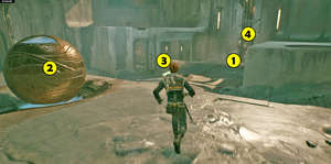 Вернувшись к локации со сферой, начните со стража (1). Затем используйте толчок на сфере (2) и установите её в полость (3). Таким образом, вы разблокируете переход к следующему местоположению (4).