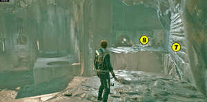 Затем пройдите по стене (7) до следующей комнаты (8) и пройдите на платформу справа.