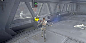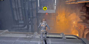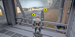 Остановите его в нужный момент и направляйтесь к стене справа (6). Используйте толчок на потрескавшейся стене и двигайтесь дальше, уничтожая штурмовиков и дроида-охранника по пути.