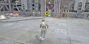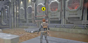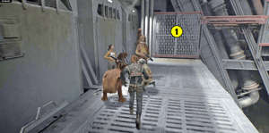 Затем подойдите к консоли (7) и используйте её, чтобы освободить оставшихся вуки, которые начнут бой в тюрьме. Подойдите к лифту слева и используйте его.