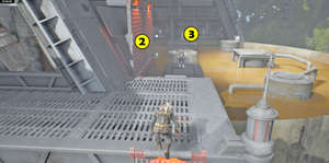 Двигайтесь вперед, бегите вдоль стены (2), уберите штурмовика, пройдите механизм и разберитесь с соперниками на другой стороне локации (3). Затем идите налево.